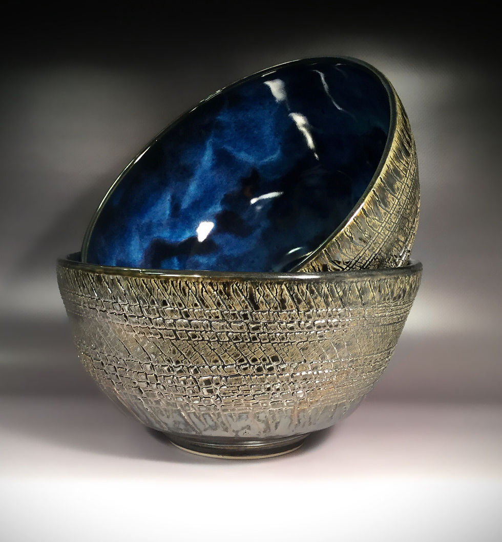 The outside has a crackled surface, caused by the exterior of the pot being torched with a heat gun prior to be being stretched on the wheel and shaped into a bowl. This dries and forms an outer shell while keeping the inside pliable. The bowl is then stretched from the inside out until it is the desired shape. Because the exterior has been dried, it now cracks as it is pushed out - the difficult part is stretching it far enough to have nice evenly thin walls without having it literally split at the seams.